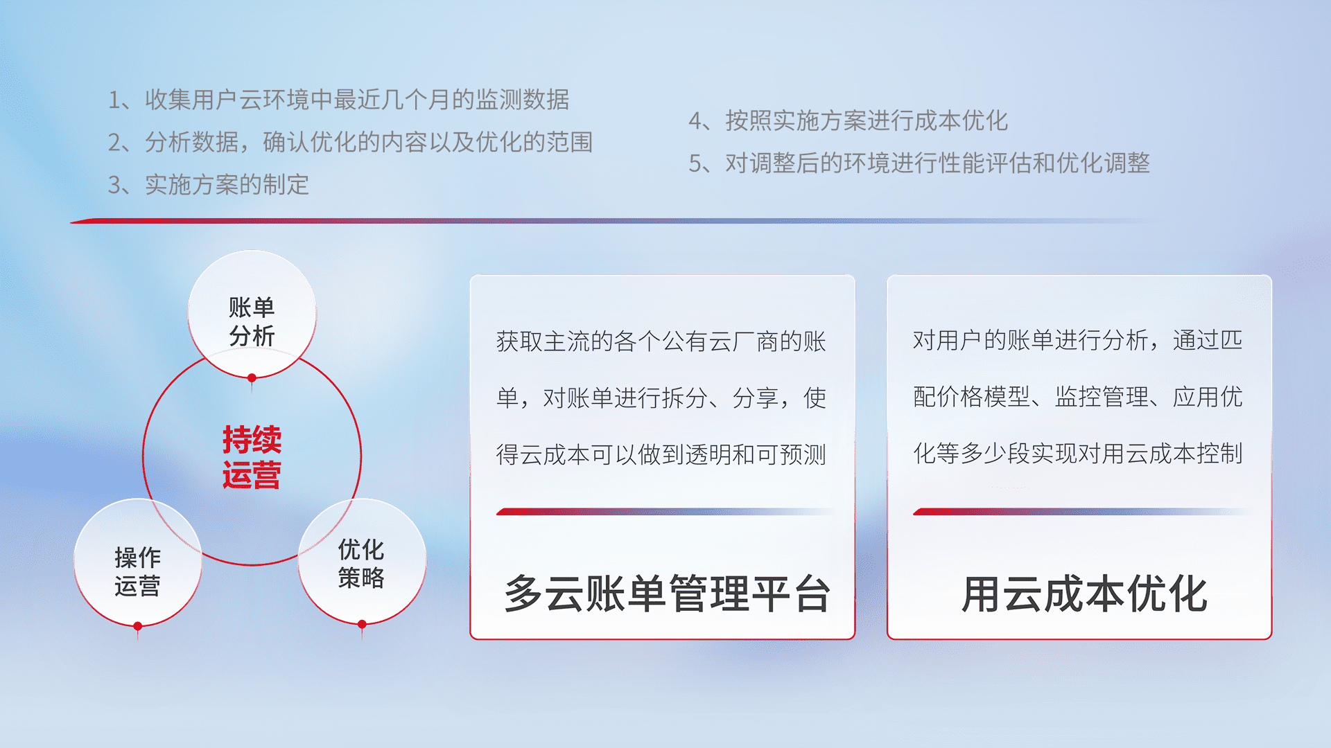 通过多云纳管,,以统一的资源数据模型把客户的云资源进行抽象和封装,,,进而实现对多云资源的统一操作,,保障云资源管理的可靠性、、稳定性与可用性。。。量身定制化运维内容,,配置、、、、开发运维、、补丁管理、、、备份、、监控、、、认证和访问管理、、审计和日常巡检等,,保障在用云过程中的可靠度,,稳定度以及高可用率。。