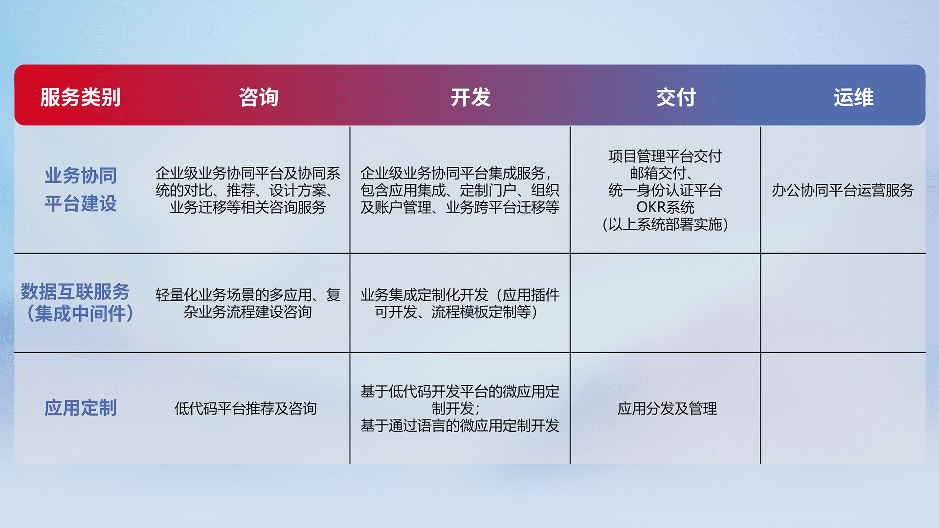 针对钉钉、、企微、、、IDaas等平台级产品提供产品的规划、、、方案、、交付、、、、定制化开发等服务,,,实现如统一协同办公、、智能客户服务、、、、混合会议管理、、、智能数据查询、、等业务场景,,,实现数字化转型。。。。